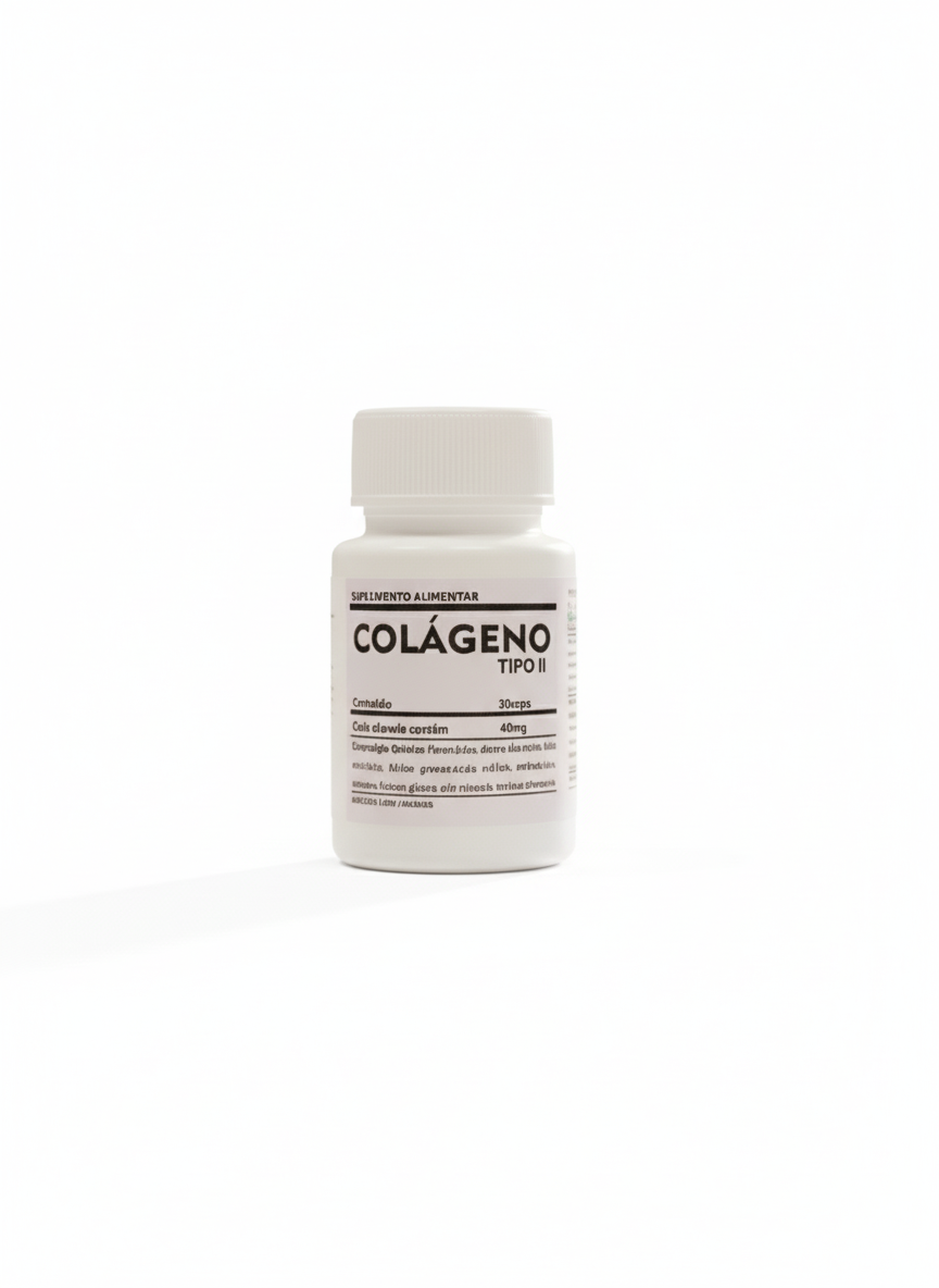 Cada cápsula contém 40mg de colágeno tipo II, com composição que inclui flavonoides, entre outros componentes naturais. O produto é apresentado em potes com 30 unidades, garantindo fácil controle da dosagem. O formato cápsula facilita a ingestão sem alterar o sabor, ideal para uso diário como complemento nutricional.